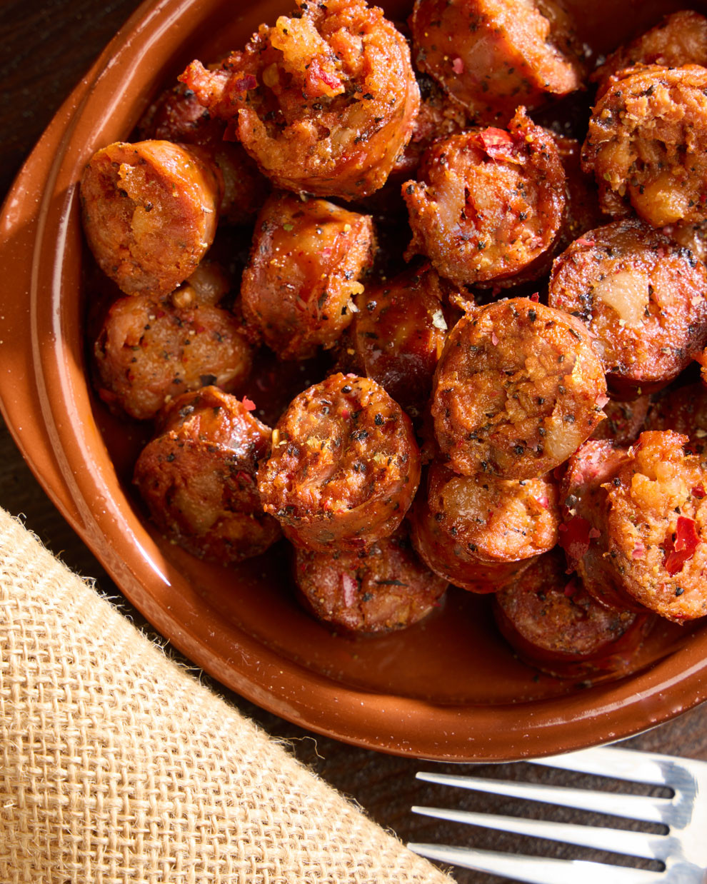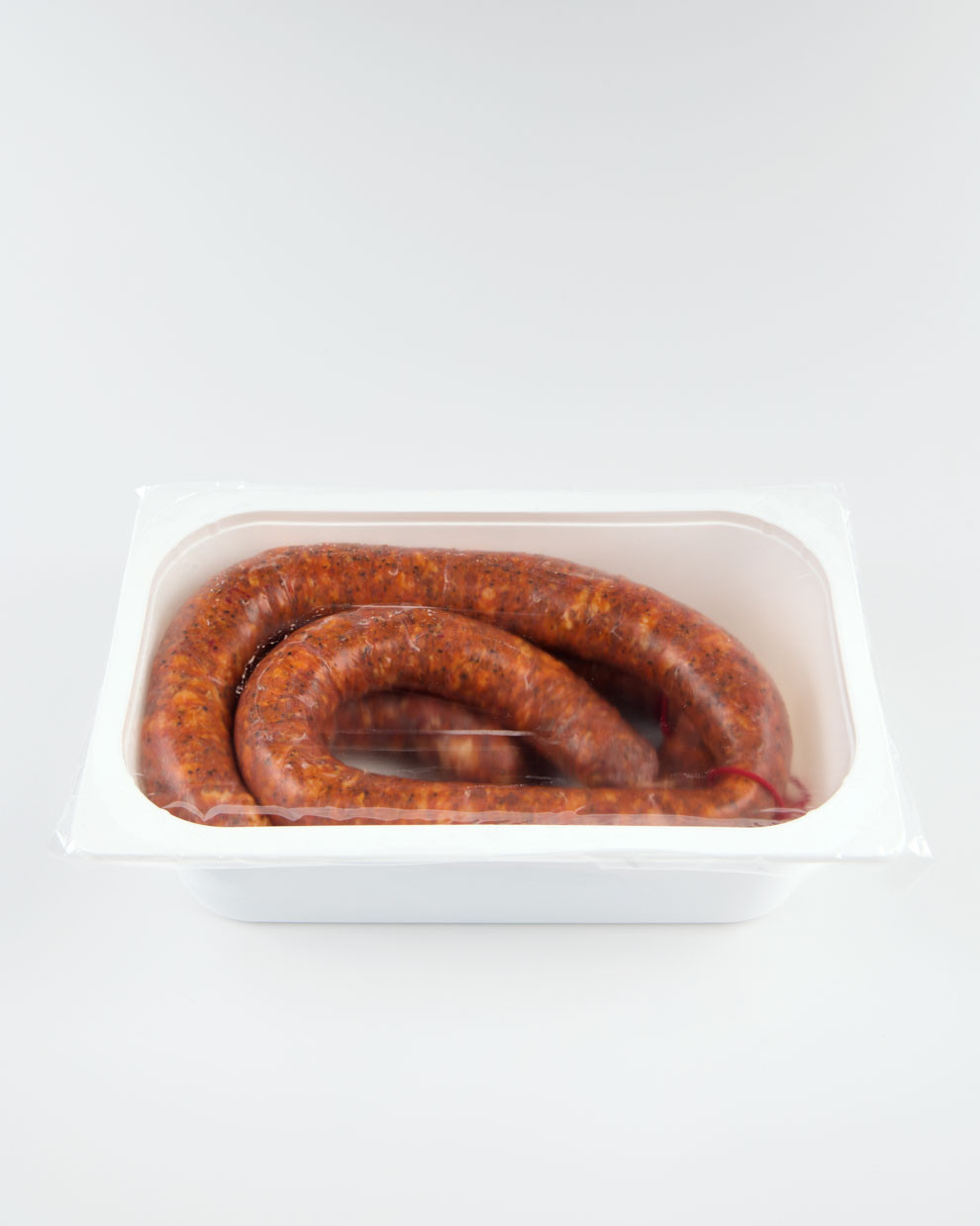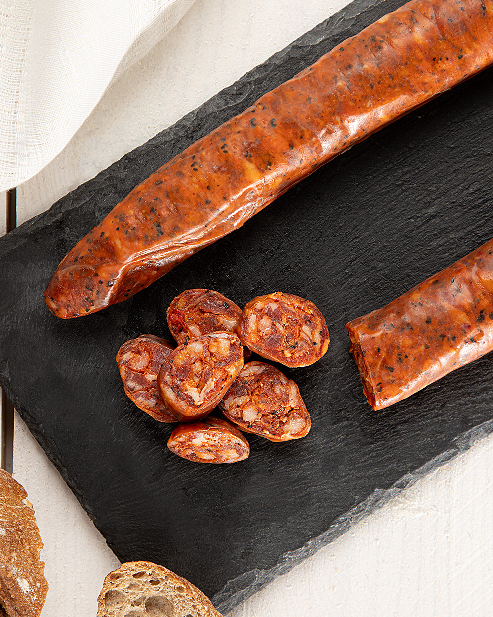 Cada pieza se prepara siguiendo el método tradicional: carne magra y panceta de cerdo troceadas, adobo con pimentón, pimienta, sal y especias naturales, y un reposo controlado antes del embutido en tripa natural. Su curación lenta garantiza una textura equilibrada y un aroma cálido, con notas que evocan la cocina tradicional del sur.