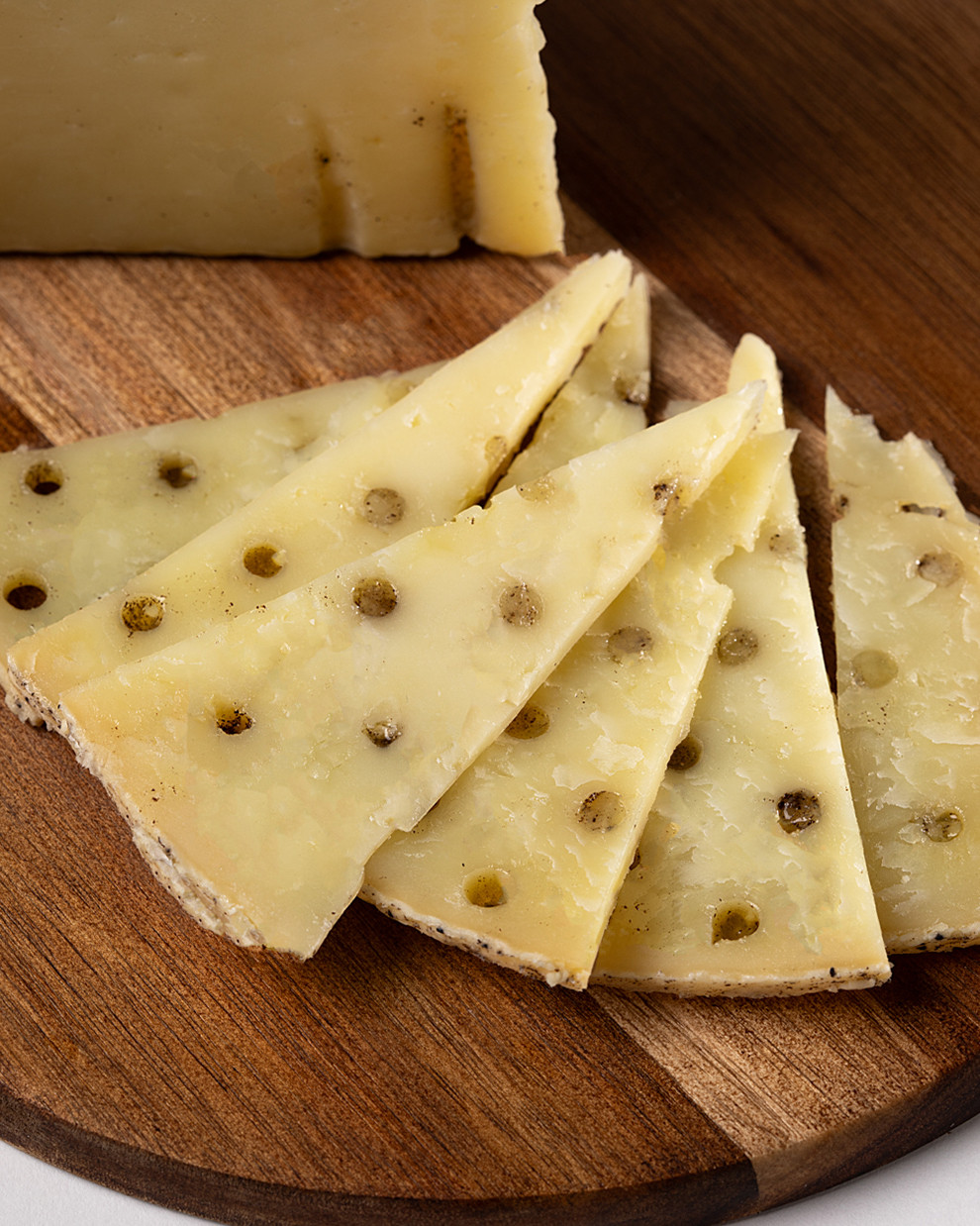 Pasta firme, ojos escasos y corte limpio con vetas de trufa; ideal para lascas finas o dados en aperitivo.