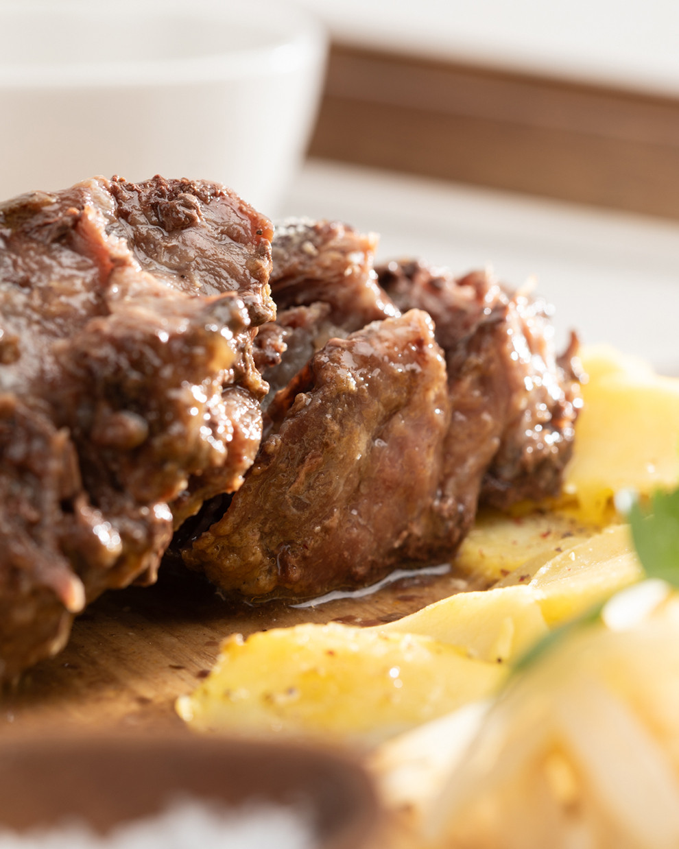 Cocción prolongada y controlada que transforma el colágeno en gelatina natural: carne tierna, melosa y jugo brillante.