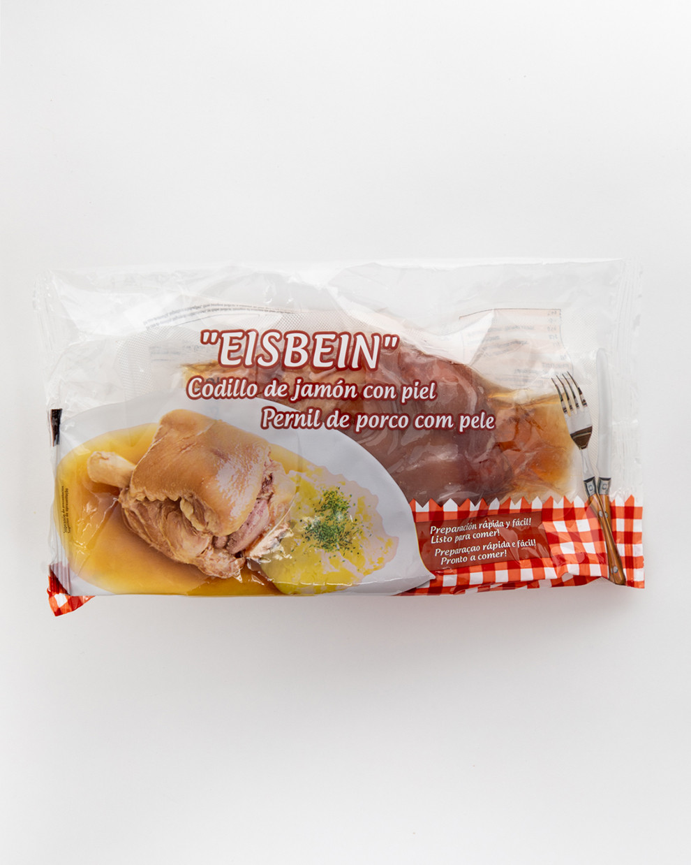 Codillo cocinado lentamente en su propio jugo; listo para atemperar y terminar en horno o sartén para un dorado crujiente y carne tierna.